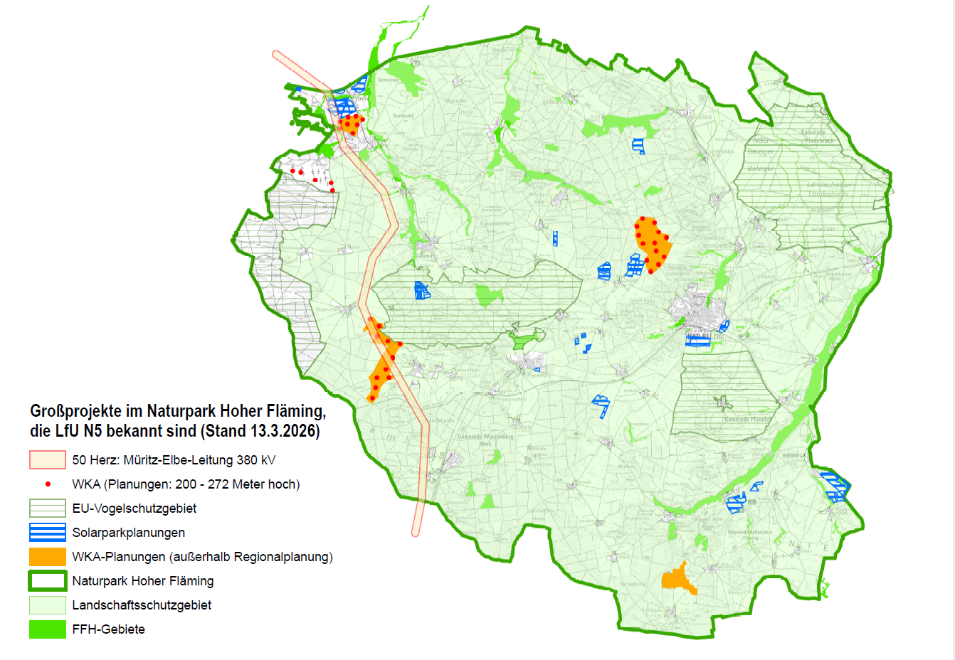Mitten im Landschaftsschutzgebiet Hoher Fläming sollen in Wiesenburg, Ortsteil Reetz und Bad Belzig, Ortsteil Lübnitz große Windindustrieanlagen errichtet werden. Neben der dauerhaften und nachhaltigen Veränderung des Landschaftsbildes ist mit erheblichen Auswirkungen auf Natur, Umwelt und die Lebensqualität der betroffenen Bevölkerung zu rechnen. In den Gemeinden Wiesenburg/Reetz und Bad Belzig/Lübnitz haben sich Bürgerinitiativen gegründet, die sich gegen den Bau der Industrieanlagen wehren. Nähere Informationen zu den geplanten Anlagen können den Menüs BI Reetz und BI Bad Belzig entnommen werden.