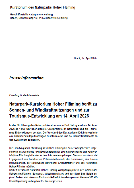 - Dienstag 14.04.2026 ab 15 Uhr - 36. Sitzung des Naturparkkuratoriums in Bad Belzig über aktuelle Großprojekte im Naturpark und die Tourismus-Entwicklungen