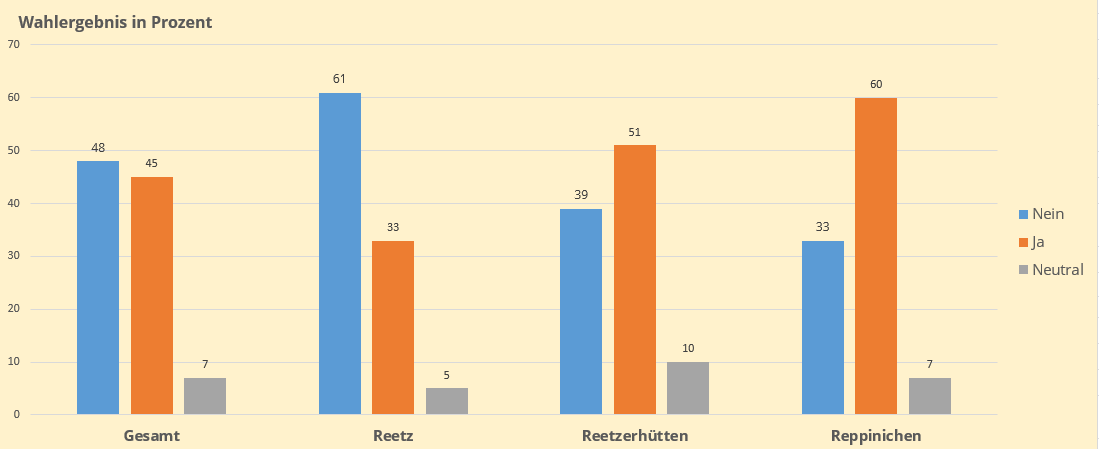 Das Abstimmung der Bürgerinnen und Bürger der Ortsteilen Reetz, Reetzerhüten und Reppinichen richtet sich mehheitlich gegen den Bau der Windenergieanlage zwischen Reetz und Repinichen bei einer Wahlbeteiligung von 82 %.