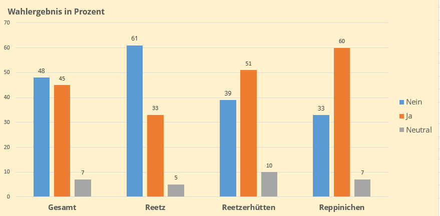 Das Abstimmung der Bürgerinnen und Bürger der Ortsteilen Reetz, Reetzerhüten und Reppinichen richtet sich mehheitlich gegen den Bau der Windenergieanlage zwischen Reetz und Repinichen bei einer Wahlbeteiligung von 82 %.
